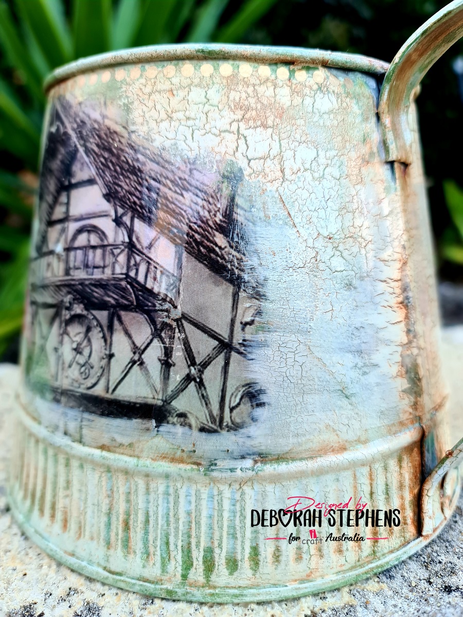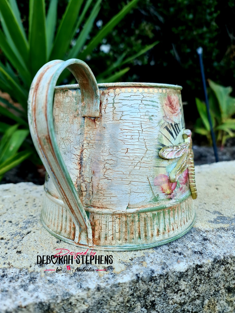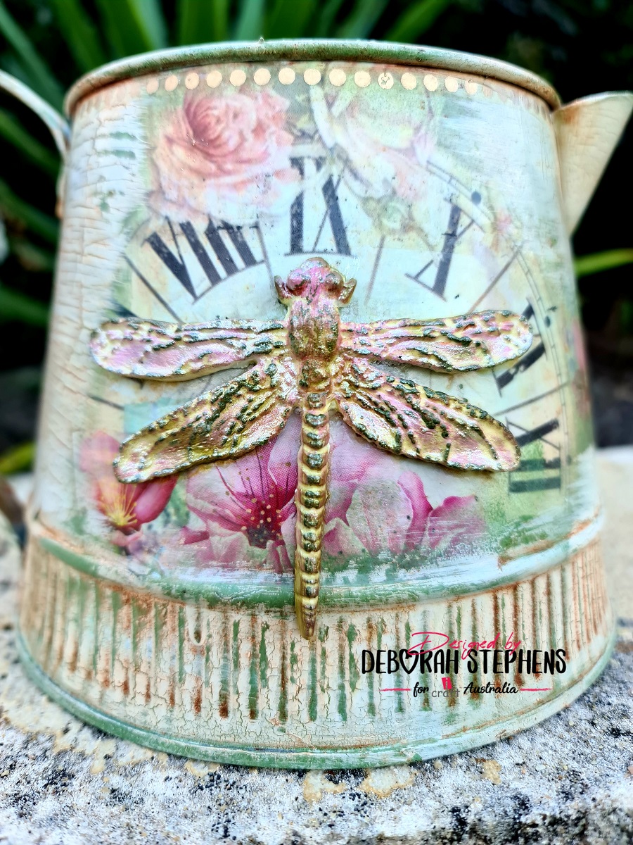 Start by applying gesso with a sponge all over the metal watering can and dry. Once cooled, apply a second coat and dry. Apply iCraft chalk paint in Cypress Green all over with a sponge. Trim Ancient Timepiece decoupage paper to get the elements to fit around the can. Glue down with iCraft decoupage glue and let dry. Apply crackling gel all over and allow to dry. Apply iCraft chalk paint Autumn Valley with a broad flat brush, fast, so that the paint doesn’t “pull” and clump. Let it dry and watch the magic happen as cracks appear. Sand certain spots so that the green is more visible. Apply a thin coat of iCraft decoupage varnish, making sure not to fill the cracks. After it dry’s, apply brown oil paint all over the surface with a brush and then rub back with a soft clean cloth. The oil paint fills the cracks and gives a more rustic effect. Allow to dry. Apply the iCraft mini gold dot insta transfers to the top of the can. I painted the dragonfly element from my stash using a mix of iCraft metallic colours and topped off with Moon White Metallic for a shimmer. I then adhered it to the middle of the can. Once the glue dried, I applied another two coats of iCraft decoupage varnish to seal all surfaces. Below are a few close up photos.